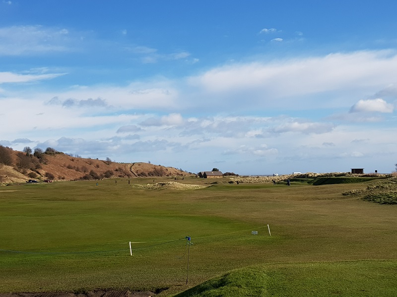 A long downhill par three into a stiff prevailing wind with coastal flats and the port of Amble as a backdrop. The weather was wild and a well-hit three wood left me pitching in from short.